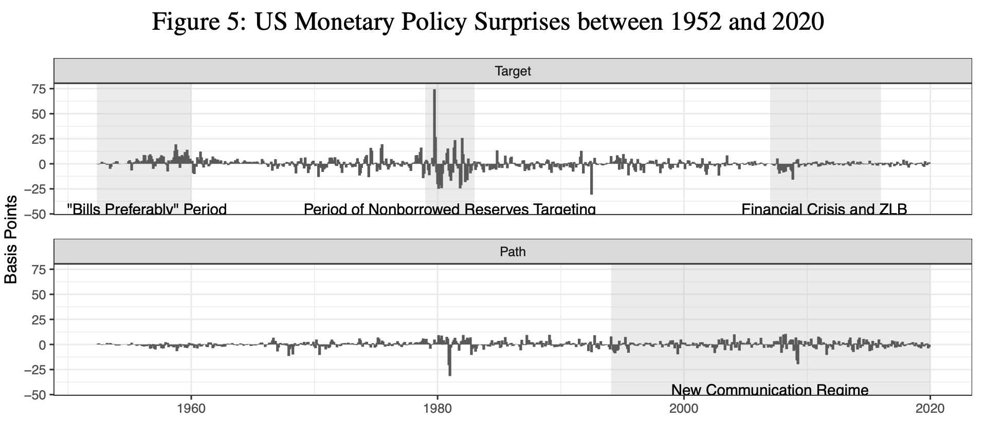 Abstract: This paper investigates the causal effects of monetary policy on asset prices and macroeconomic activity using a high-frequency identification strategy applied to newly digitized financial data spanning 1952 to 2020. By isolating monetary policy surprises from Treasury yield movements around policy announcements, the study disentangles classical shocks affecting current short-term rates from forward-path shocks influencing expectations of future short-term rates. The findings reveal significant shifts in monetary transmission over time, with forward-path shocks emerging as key drivers of corporate bond spreads and equity returns since the 1990s, while classical shocks primarily affect short-term yields. Moreover, contractionary monetary policy significantly reduces production, employment, and prices, with stronger effects during recessions than expansions. These results provide new insights into the evolving dynamics and state-dependent nature of monetary policy’s impact on financial markets and the broader economy.